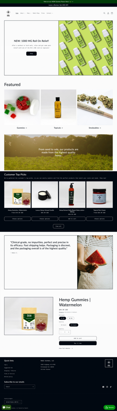 Rebel Gardens is a fourth-generation family farm in South Georgia that’s turned its deep agricultural roots into a modern wellness brand. When I designed their website, my goal was to honor their legacy while introducing their innovative line of hemp and low-THC cannabis products to a wider audience. The site blends earthy storytelling with a clean, contemporary layout that highlights their “from seed to sale” philosophy—celebrating both the craftsmanship of farming and the science behind holistic health. Every page was designed to feel authentic, grounded, and proud of its Southern heritage while still appealing to a modern consumer seeking natural, homegrown remedies.